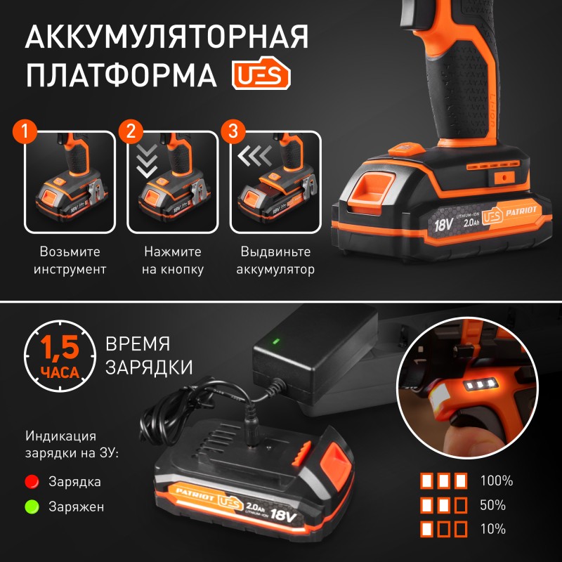 Легкий аккумулятор Li-Ion обеспечивает постоянный крутящий момент до полной разрядки аккумуляторной батареи. Аккумуляторная платформа UES поддерживает более 60 инструментов.