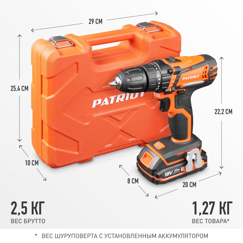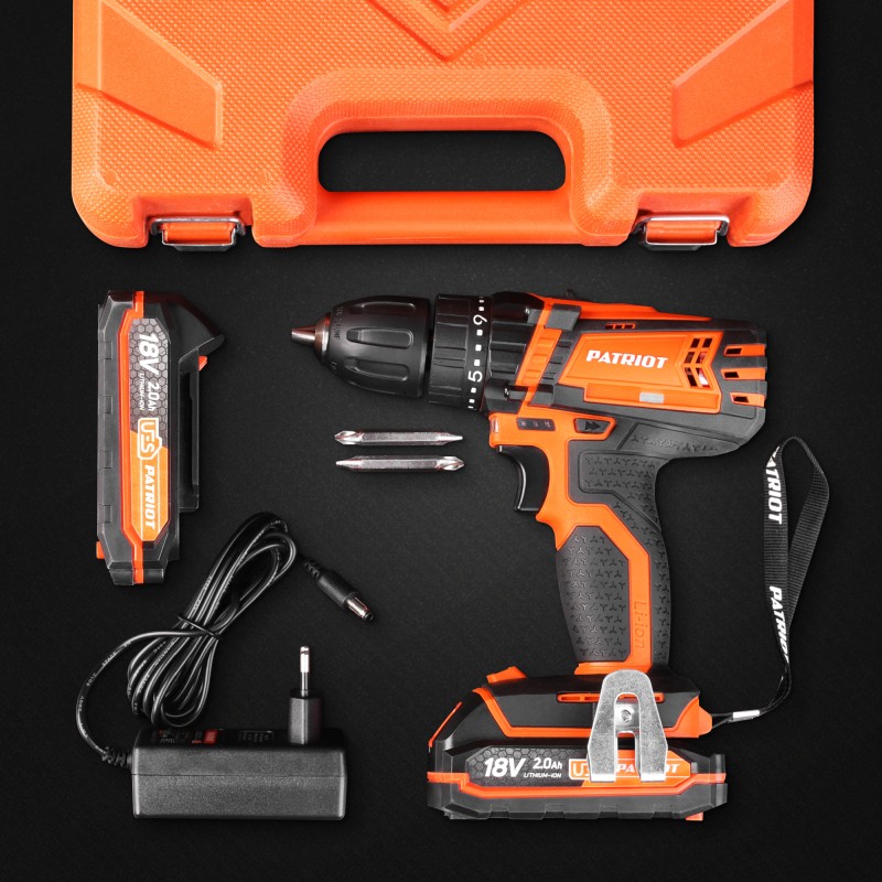 18 В, 2.0 Ач, Li-ion, 2 скорости 350-1350 об/мин, крутящий момент 29 Нм, 2 АКБ и ЗУ в комплекте, кейс