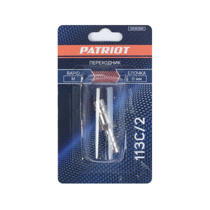 Быстросъёмный переходник PATRIOT 113С/2 для присоединения шланга к пневмоинструменту, компрессору или пневмолинии. Переход рапид - «елочка» 8 мм. Монтаж осуществляется с помощью хомута.