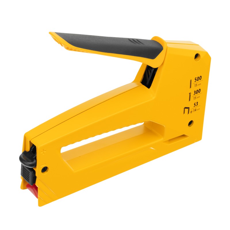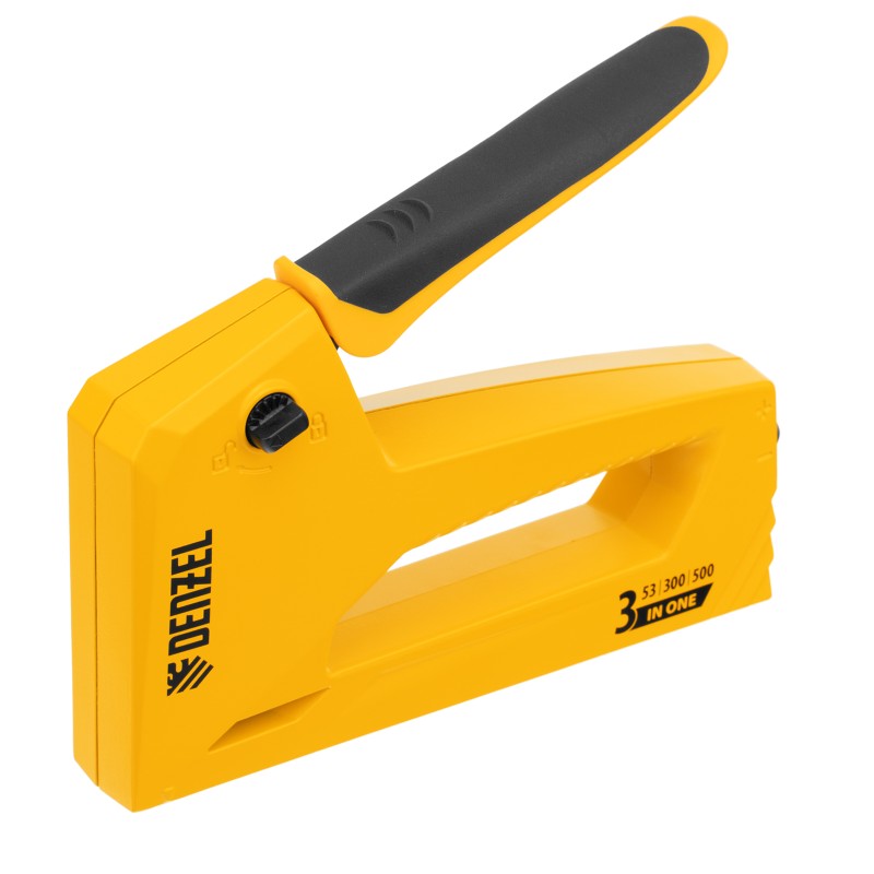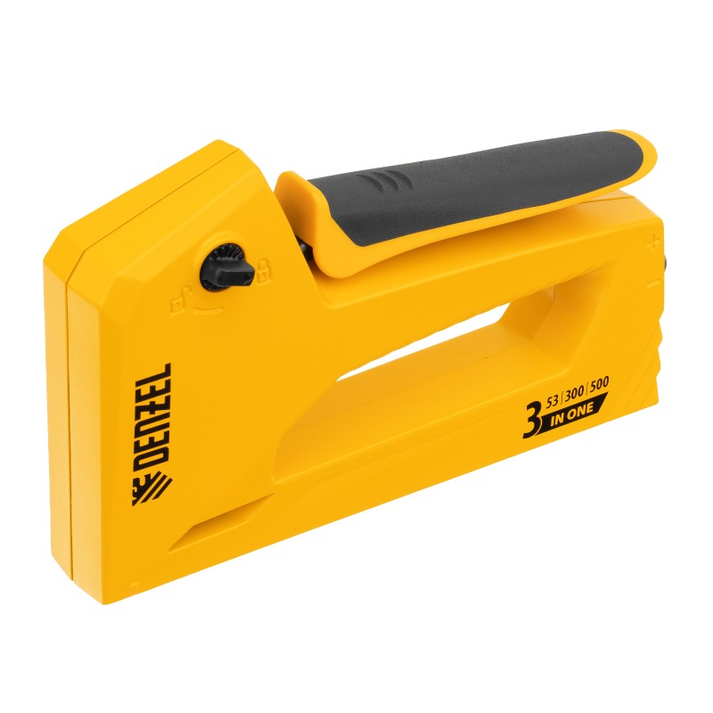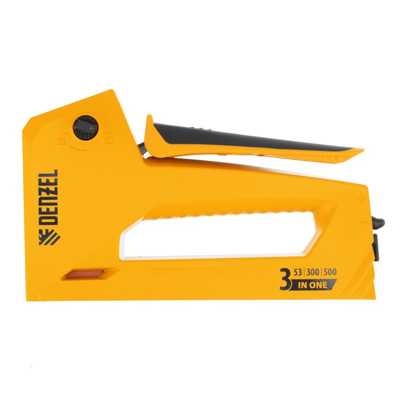 Мебельный степлер Denzel 40214 в алюминиевом корпусе работает со скобами типа 53 размером 6-14 мм, а также гвоздями 300 и штифтами 500 длиной 15 мм. Используется для скрепления листовых материалов: фанеры, ДВП, ДСП, оргалита, а также для фиксации пленки и теплоизоляционного материала на деревянном основании. Эффективный ударный механизм позволяет на 30% снизить нагрузку на руку. Инструмент пригодится для обивки мебели, укладки напольных покрытий, выполнения ремонтных и багетных работ.