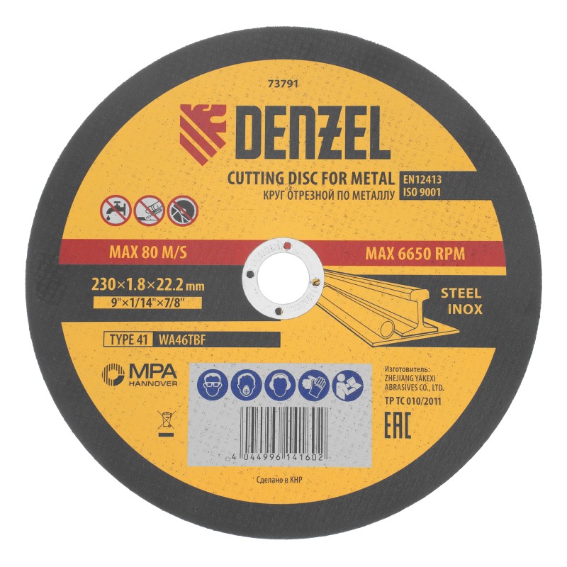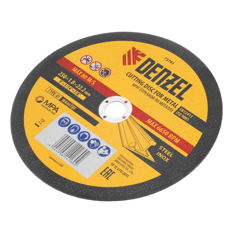 Отрезной круг по металлу Denzel WA46TBF 73791 диаметром 230 мм и толщиной 1,8 мм устанавливается на углошлифовальную машину с посадочным размером 22,2 мм. Предназначен для сухого резания углеродистых и нержавеющих сталей. Максимальная частота вращения составляет 6650 об/мин. Круг пригодится в слесарной мастерской.
