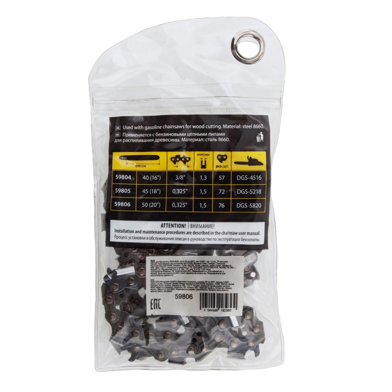 Цепь Denzel 59806 с шириной паза 1,5 мм используется с бензопилой Denzel DGS-5820, состоит из 76 звеньев с шагом 0,325″ и надевается на пильную шину длиной 50 см (20″). Оптимальна для проведения ремонтных и строительных работ, распиловки бревен, срезания сучьев и веток в саду.