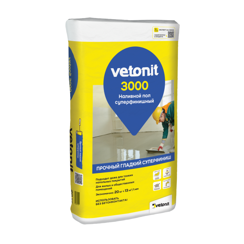 Наливной пол Vetonit 3000 - предназначен для суперфинишного выравнивания под дальнейшую укладку покрытий. Удобен в работе за счет оптимальной текстуры и максимальному классу подвижности раствора (Рк7). Мелкофракционный наполнитель, входящий в состав продукта, позволяет создать прочную гладкую поверхность, что особенно важно при укладке требовательных напольных покрытий. Прочность при сжатии не менее 20 МПа. Наливной пол подходит дальнейшую укладку любых напольных покрытий в жилых и общественных помещениях. Укладка возможна уже через 1-3 дня (в зависимости от условий окружающей среды, толщины слоя и типа покрытия). Подходит в качестве финишного слоя системы «Теплый пол». Для ручного нанесения внутри помещений.