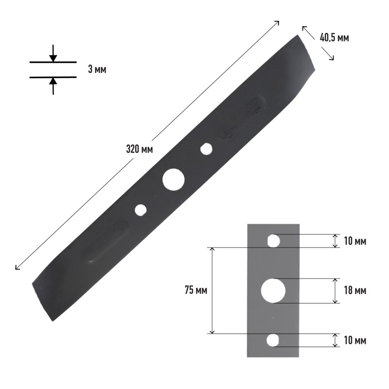 длина 320 мм, центральное 18 мм, ширина 40.5 мм, толщина 3 мм, межцентровое 75 мм, сталь, для газонокосилок PT 1132 E, PT 1134E