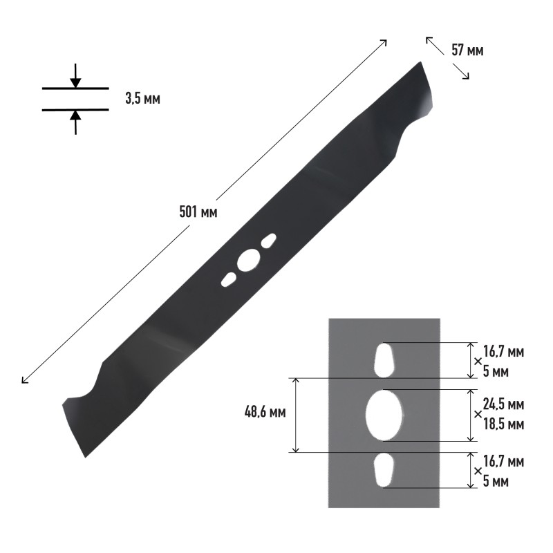 длина 501 мм, центральное 24.5х18.5 мм, ширина 57 мм, толщина 3.5 мм, межцентровое 48.6 мм, сталь, для газонокосилок PT 53 BSE, PT 52 LS, PT 53 LSE