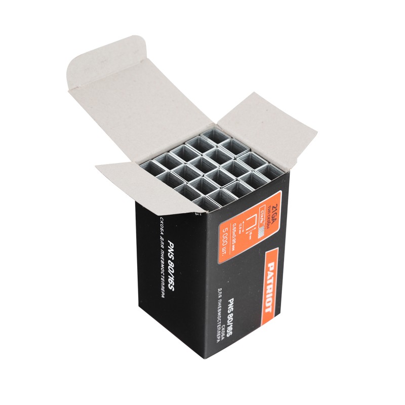 Набор скоб для пневмостеплера PATRIOT PNS 80/16 S. В комплект входит 5 000 скоб типа 21 GA размером 16х12,8 мм из закаленной стали.