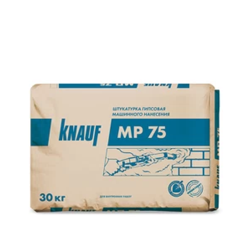 Сухая штукатурная смесь на основе гипса с полимерными добавками. Предназначена для высококачественного оштукатуривания стен и потолков внутри помещений. Штукатурку Кнауф-МП 75 можно использовать для отделки помещений с нормальной влажностью, а также в кухнях и ванных комнатах с покрытием, обеспечивающим защиту от увлажнения. Наносится на все обычные твердые основания: кирпичная кладка, цементная штукатурка, бетон и т.п. Внимание! Наносится машинным способом.