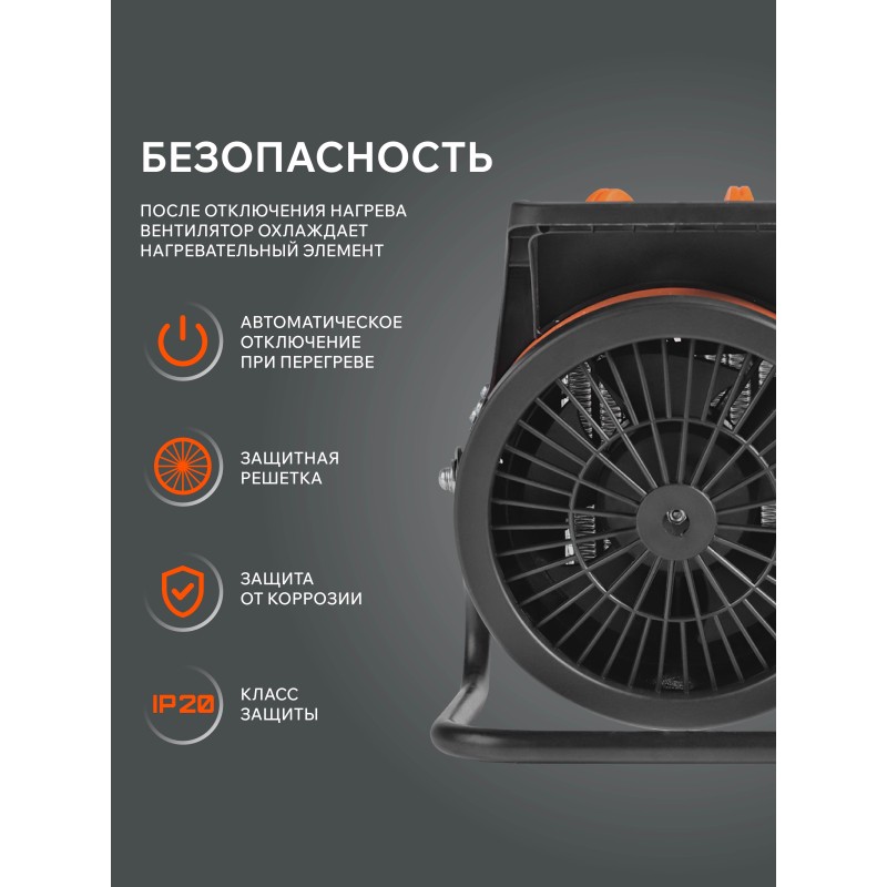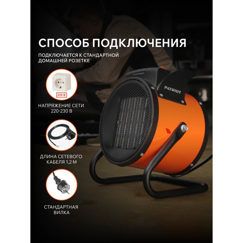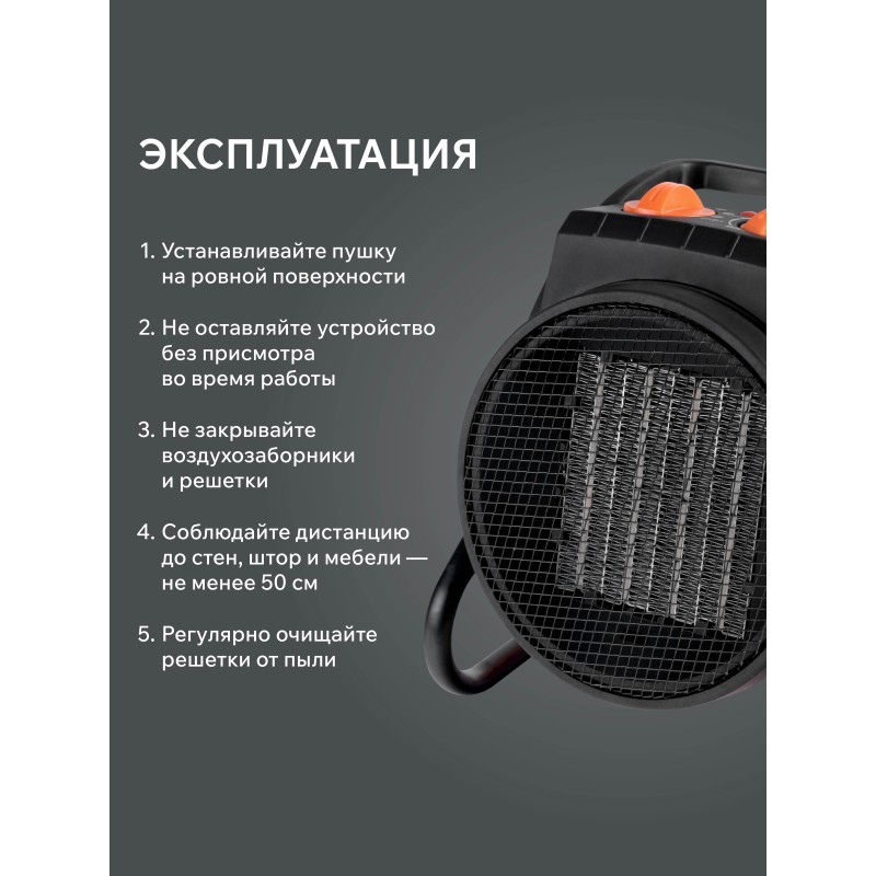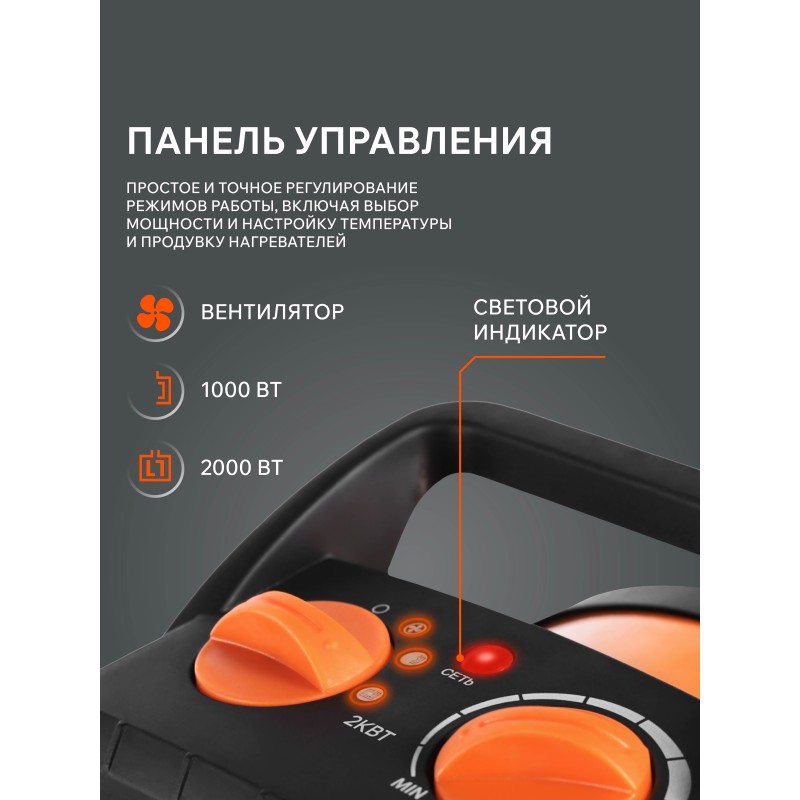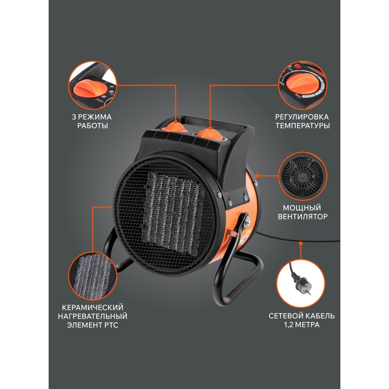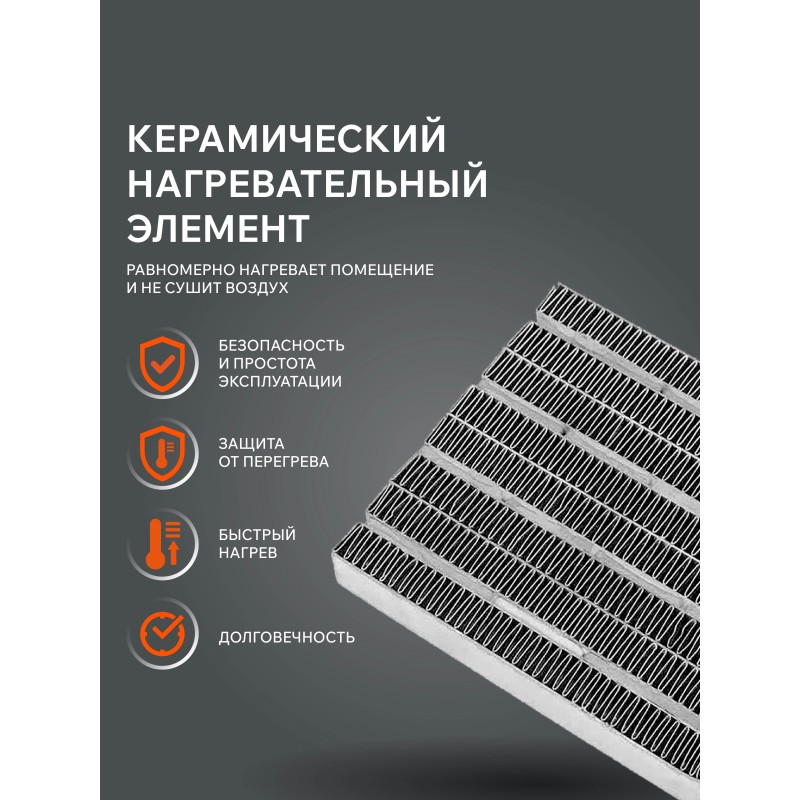 Компактный, мобильный, надежный нагревательный электроприбор. Служит для обогрева воздуха в различных помещениях. В жаркое время года возможно использование прибора в качестве вентилятора, без включения нагревательных элементов. В обогревателе используется высококачественный керамический полупроводниковый нагревательный элемент PTC, при работе которого уровень мощности автоматически корректируется в зависимости от изменений температуры окружающей среды. За счет уникальных свойств нагревательного элемента, увеличивается срок службы прибора. В обогревателе установлено мощное воздуходувное устройство, благодаря которому приятный горячий воздух подается с большой скоростью, что позволяет быстро и эффективно прогреть помещение.