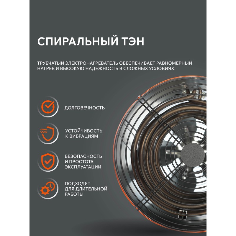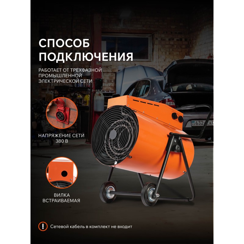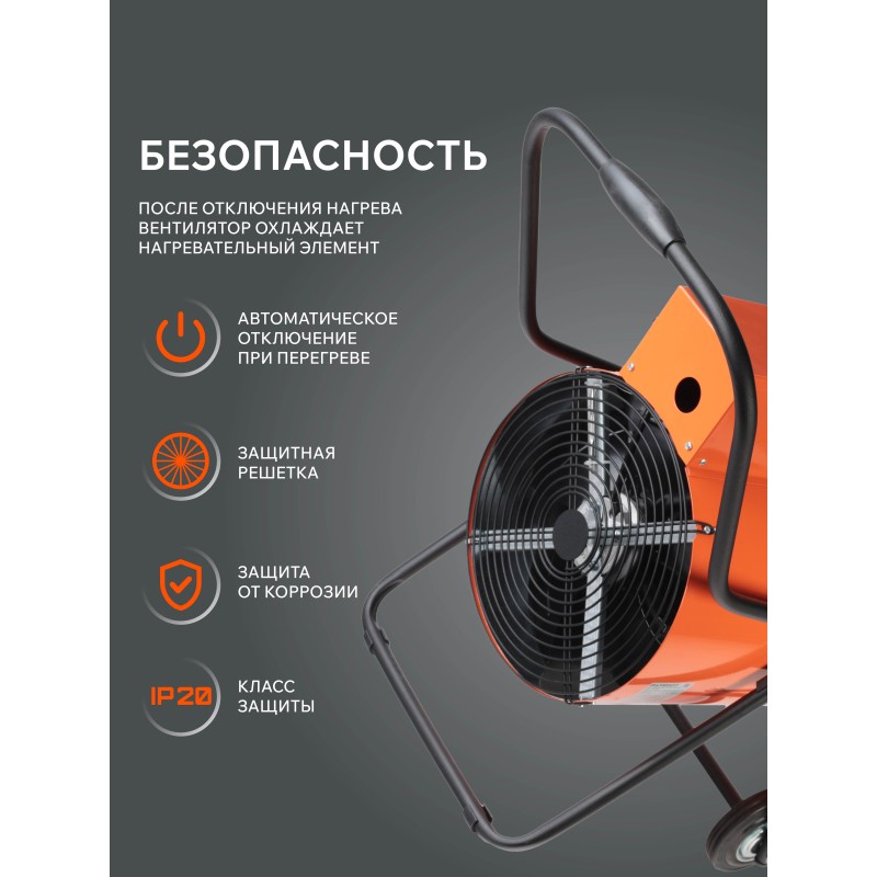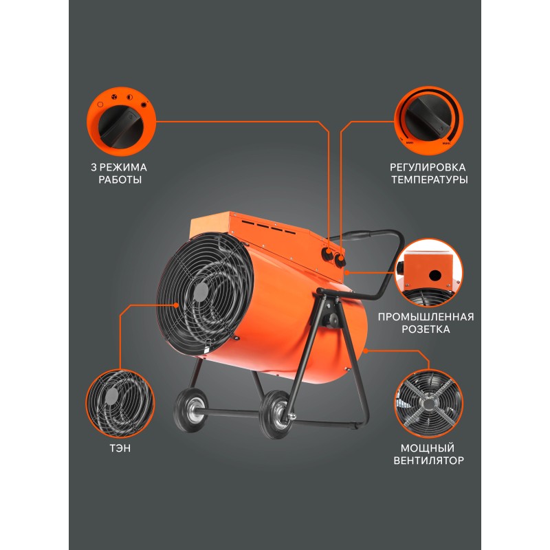 Тепловая пушка электрическая предназначена для обогрева воздуха в различных помещениях, таких как: промышленные ангары, склады, гаражи, торговые павильоны, строительные объекты и т.д. Корпус обогревателя выполнен в двойном исполнении, что не позволяет ему нагреваться во время эксплуатации. В жаркое время года возможно использование прибора в качестве вентилятора, без включения нагревательных элементов.